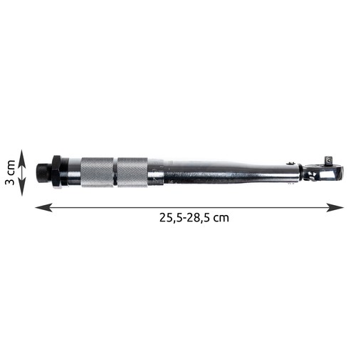 - SPECIFICATION – material: chrome-molybdenum steel, other: rubber + case (PP), right/left wrench; ratchet head; minimum torque: 5 (Nm); maximum torque: 25 (Nm); for tightening and loosening screw connections: yes; universal: yes, for square and hexagonal screws, hooks, motorcycle nuts, etc.; torque: yes; set includes: wrench and case; square drive (pin): 5mm; width: 3 cm; dimensions: (length adjustment): 25.5-28.5cm; wrench weight: 0.6kg; weight in packaging: 0.8kg