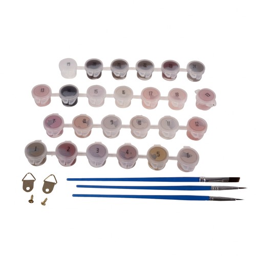 - Komplektis: lõuend puitraamil, värvid, 3 pintslit, näidispilt, 2 konksu ja kruvid, 2 jäljevaba konksu