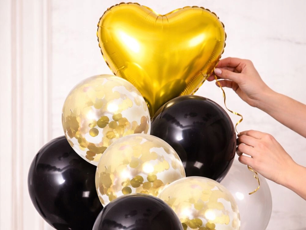 - Kuldse konfettiga läbipaistvad õhupallid – läbipaistvad konfetiõhupallid annavad dekoratsioonile luksuslikuma ilme ning lisavad üldkujundusele sära ja pidulikkust. Väike nipp: kui soovid, et konfetid kinnituksid palli külgedele, siis lisa enne täispuhumist õhupalli sisse väike tilk vett või hõõru palli vastu riiet, et tekitada palli sees staatiline elekter.