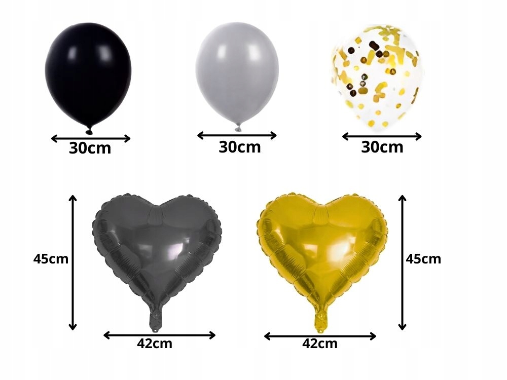 - Komplektis 18 õhupalli – 2 suuremat südamekujulist palli (must ja kuldne) ning 16 lateksõhupalli (4x must, 4x hõbehall, 4x läbipaistev kuldsete konfettidega)