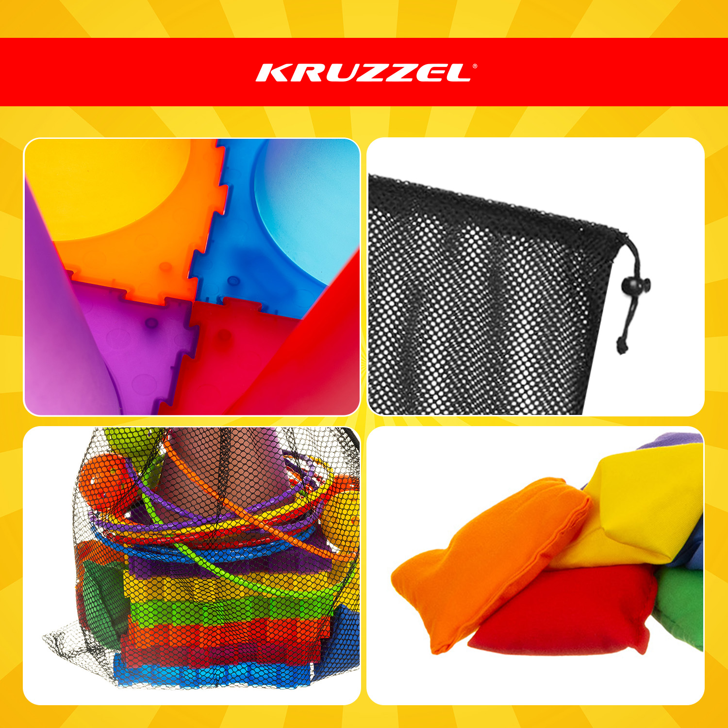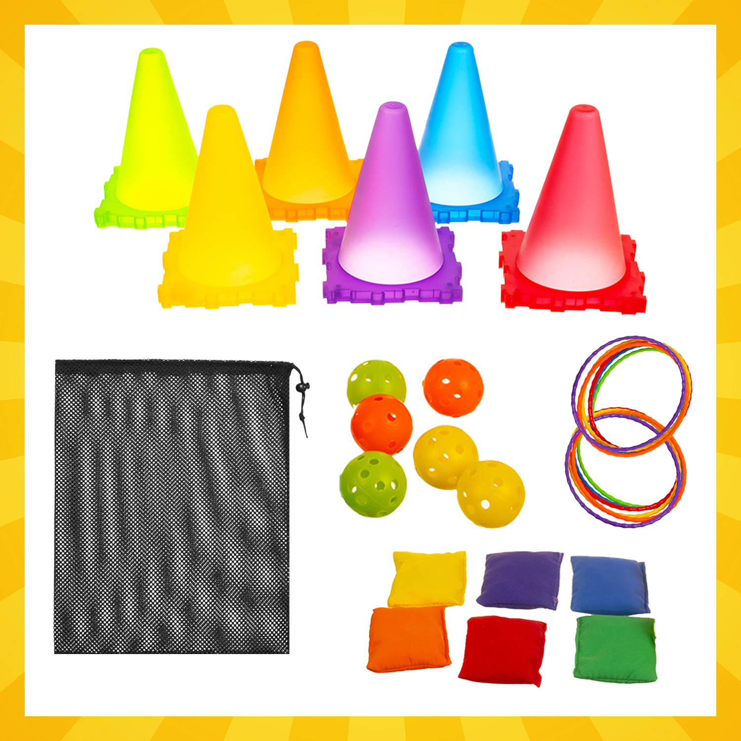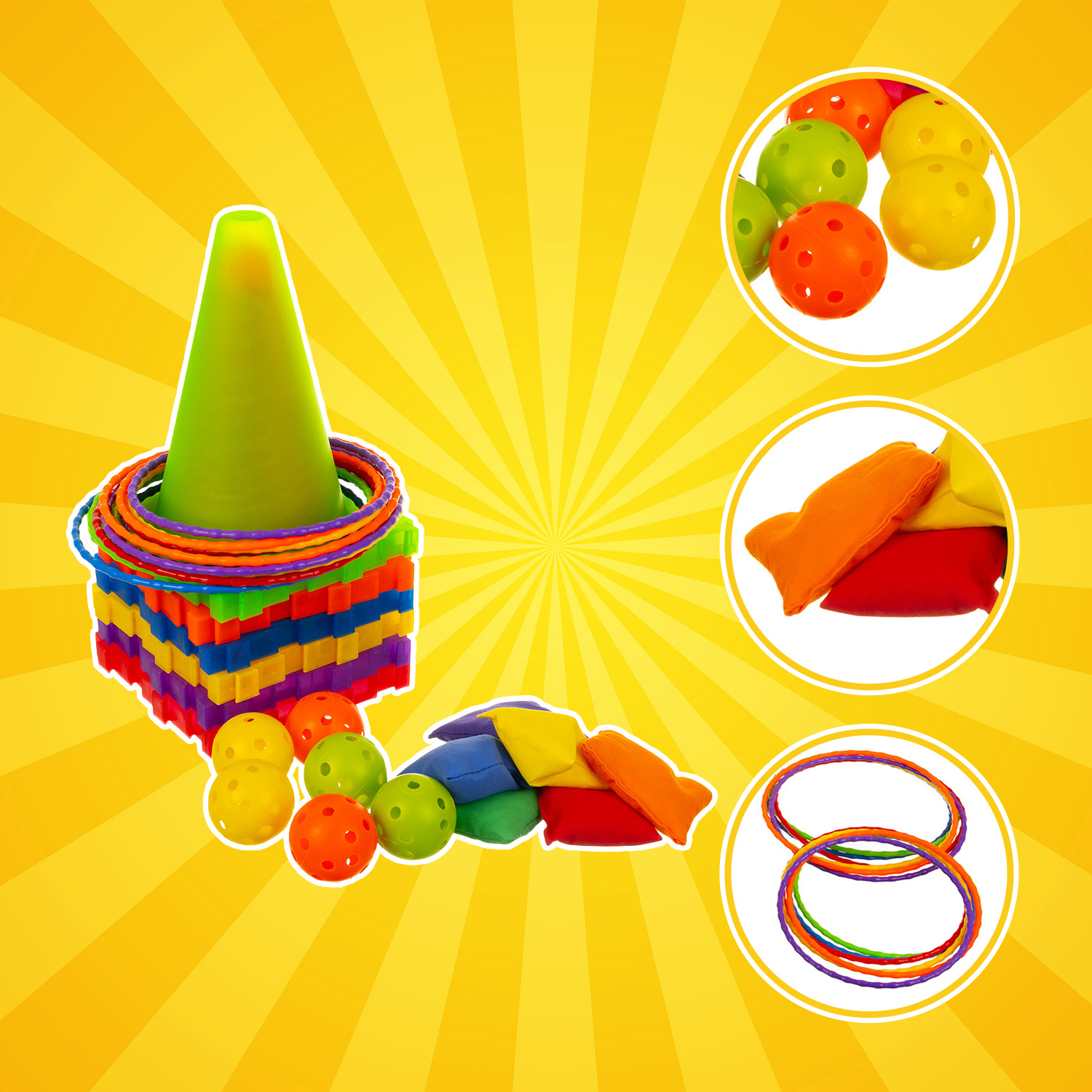 Sisaldab 6 koonust (18 × 14 cm, saab kasutada mõlemat pidi ja üksteise külge kinnitada), 6 väikest rõngast (⌀ 14 cm), 6 suurt rõngast (⌀ 16 cm), 6 palli (⌀ 4 cm), 6 viskekotti (7 × 5.5 cm) ja hoiukotti -