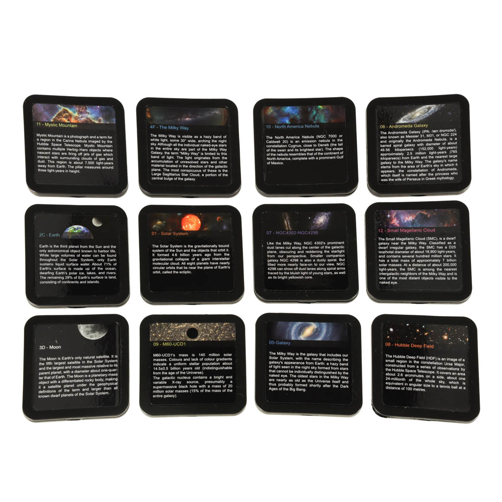 12 vahetatavat kosmoseketast – kujutavad selliseid objekte nagu Maa, Päikesesüsteem, Linnutee, Kuu ja paljud teised. Igal slaid-kettal on ka ingliskeelne lühikirjeldus.
