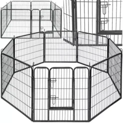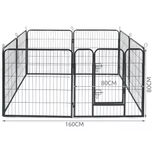 The multi-function playpen consists of eight panels, one of which is a gate. Designating a specific area indoors or outdoors aids in care and ensures safety. The cage is not only easy to set up and use immediately after installation, but also a pen consisting of eight panels that can be freely configured. Designed for both indoor and outdoor use, it is resistant to both high and low temperatures and all other weather conditions. The playpen is safe and stable. All parts are precisely rounded, significantly minimizing the risk of injury even in the event of direct, dynamic contact. It guarantees an enclosed area of up to 2.56 square meters, making it an excellent solution for keeping pets such as dogs or rabbits. The multi-function playpen is equipped with a movable gate with double security against opening. The set includes all the components necessary to prepare the playpen for use. Assembly is simple and requires little time or special skills. Once folded, it takes up little space – simply remove the bars.