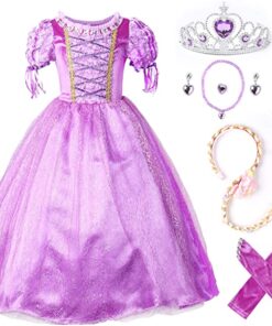 * Komplektis uhke kleit, kroon, võlukepp, kätised, Rapuntseli patsiga peavõru, kaelakee, kõrvarõngad, sõrmus