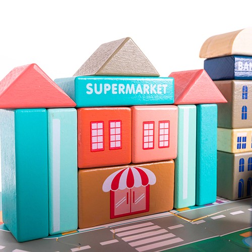 Loo oma väike linn otse lastetoas – 115 puidust klotsi ja puslematt annavad lõputult võimalusi tänavate, hoonete ja linnaelu stseenide ehitamiseks. Mitmekesised detailid innustavad last planeerima, katsetama ja oma ideid ellu viima. Kvaliteetsest puidust valmistatud klotsid on siledad ning ümarate servadega, et mäng oleks turvaline ja mõnus.