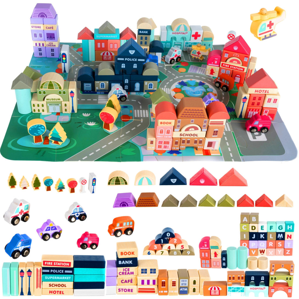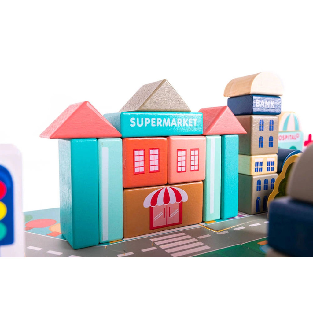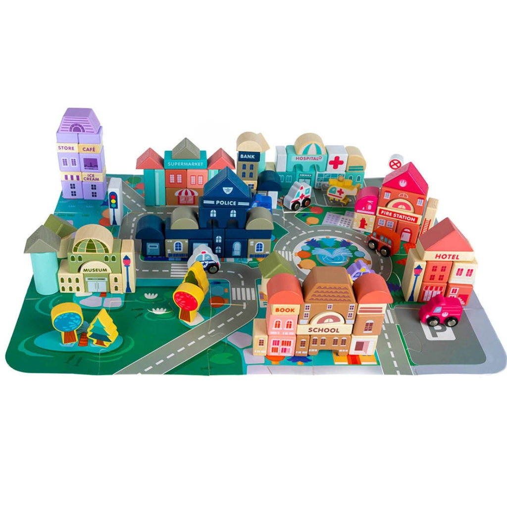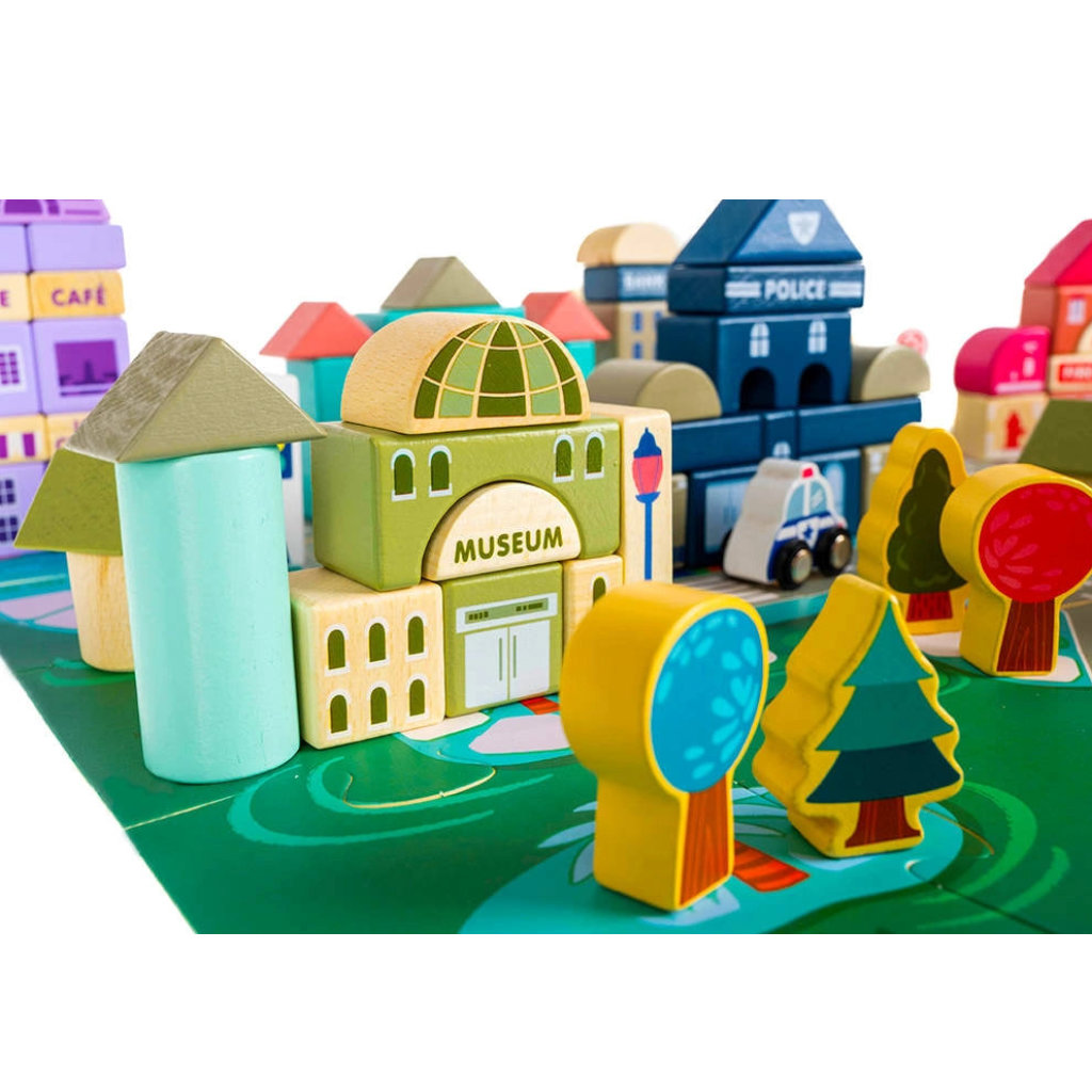 * Linna saab rajada kõik põhilised asutused – kooli, panga, haigla, politseijaoskonna, raamatukogu, tuletõrjedepoo, supermarketi, muuseumi, hotelli, kohviku, samuti pargid, parkla jms. Komplektis on ka puud (6tk) ning mõned liiklusmärgid, valgusfoor, tänavavalgustid. See võimaldab lapsele läbi mängu seletada kuidas linn toimib, mis eesmärgil on linnas erinevad hooned jpm. Ning loomulikult annab selline linn aluse pikkadeks ja sisukateks fantaasiamängudeks.