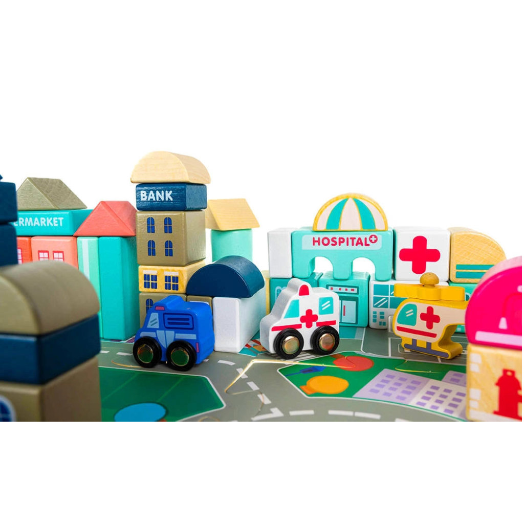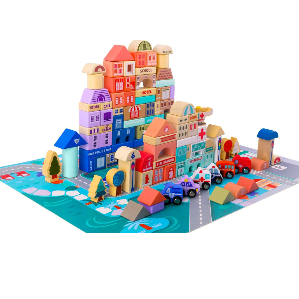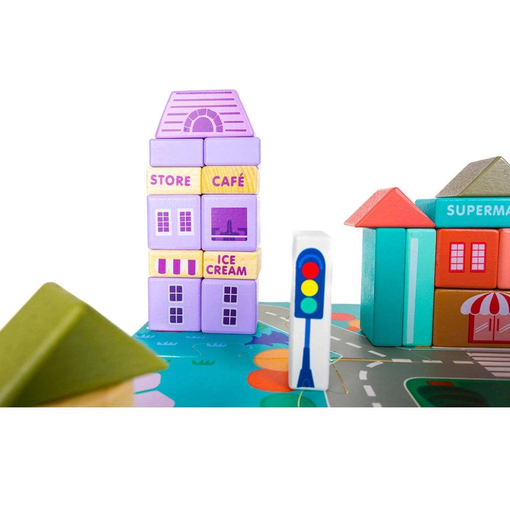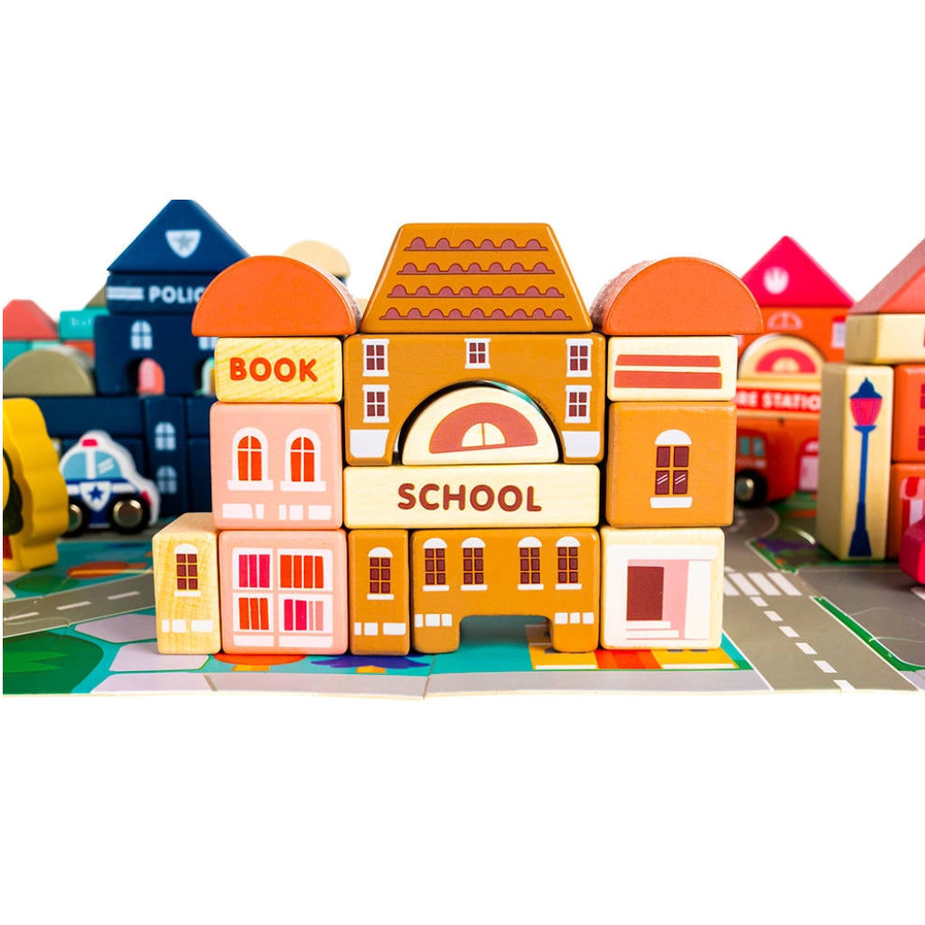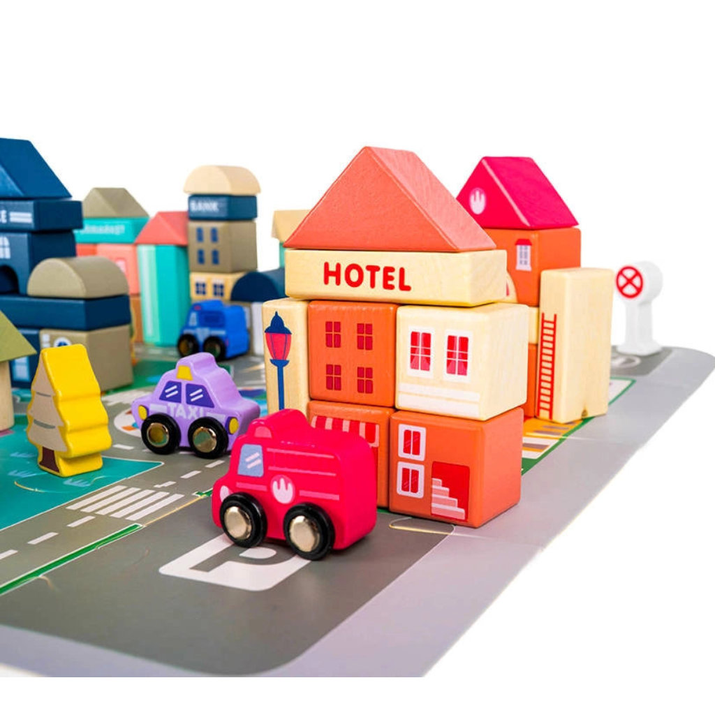 * Linna saab rajada kõik põhilised asutused – kooli, panga, haigla, politseijaoskonna, raamatukogu, tuletõrjedepoo, supermarketi, muuseumi, hotelli, kohviku, samuti pargid, parkla jms. Komplektis on ka puud (6tk) ning mõned liiklusmärgid, valgusfoor, tänavavalgustid. See võimaldab lapsele läbi mängu seletada kuidas linn toimib, mis eesmärgil on linnas erinevad hooned jpm. Ning loomulikult annab selline linn aluse pikkadeks ja sisukateks fantaasiamängudeks.