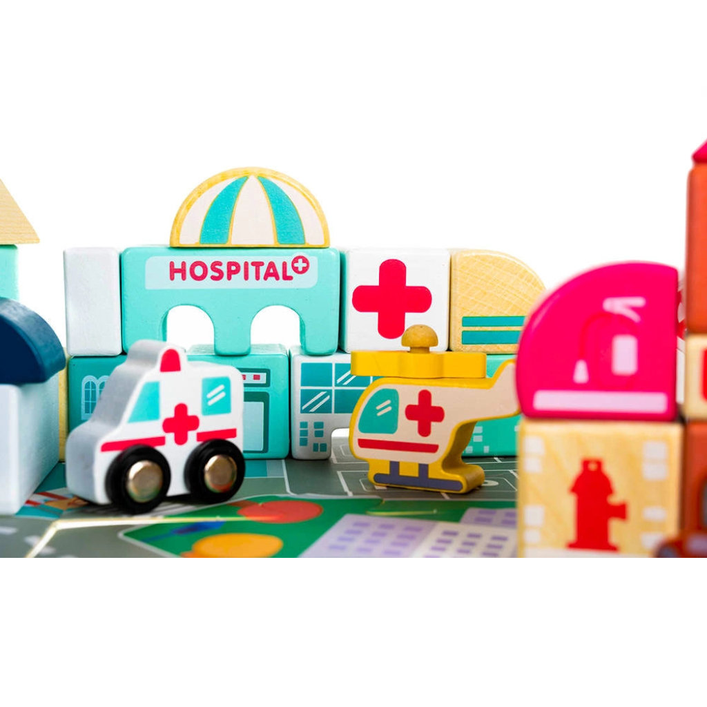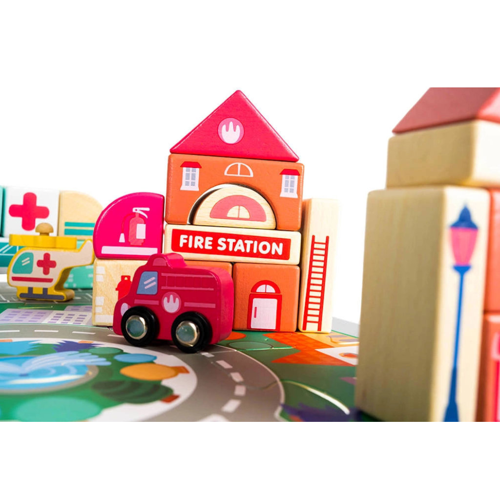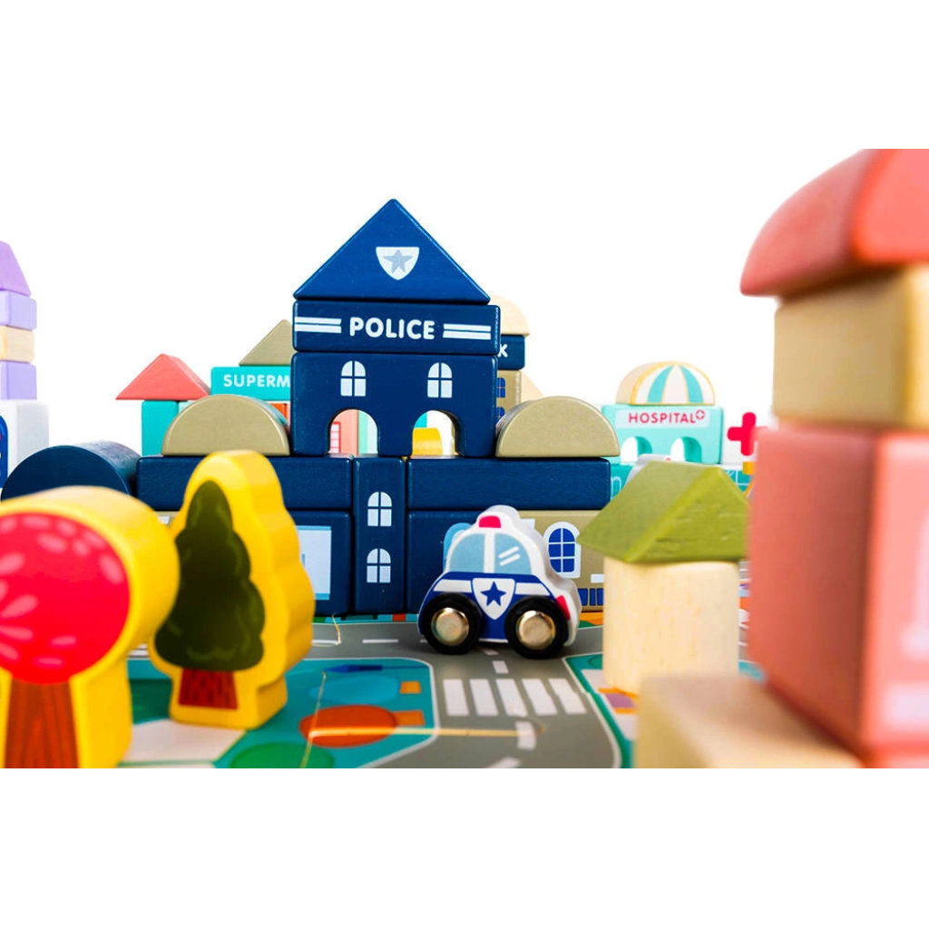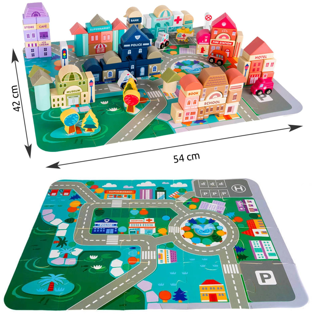 * Linna saab rajada kõik põhilised asutused – kooli, panga, haigla, politseijaoskonna, raamatukogu, tuletõrjedepoo, supermarketi, muuseumi, hotelli, kohviku, samuti pargid, parkla jms. Komplektis on ka puud (6tk) ning mõned liiklusmärgid, valgusfoor, tänavavalgustid. See võimaldab lapsele läbi mängu seletada kuidas linn toimib, mis eesmärgil on linnas erinevad hooned jpm. Ning loomulikult annab selline linn aluse pikkadeks ja sisukateks fantaasiamängudeks.