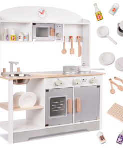 * Kõik elemendid (peale valamu) on valmistatud puidust, hoolikalt töödeldud ning värvitud ohutute pastelsete värvidega.