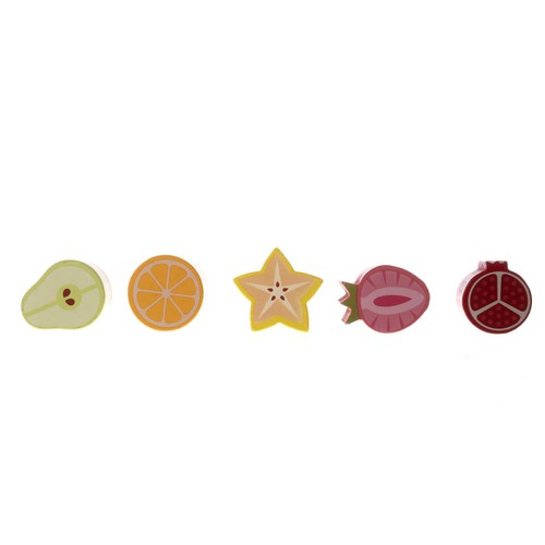 4) Kujundi sorteerija – igale kujundile tuleb leida sobiva kujuga auk – arendab nii loogikat kui käelist osavust. Mängus 5 puuviljade kujulist klotsi. Kuubiku kaan käib pealt ära, et klotsid taas kätte saada.
