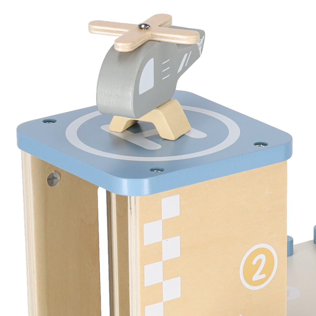 Komplektsus: parkimismaja liftiga, 3 autot, helikopter, liiklusmärgid, tõkkepuu, tankla koos kütusepumbaga, 9 teeelementi, kinnitusdetailid, kasutusjuhend.
