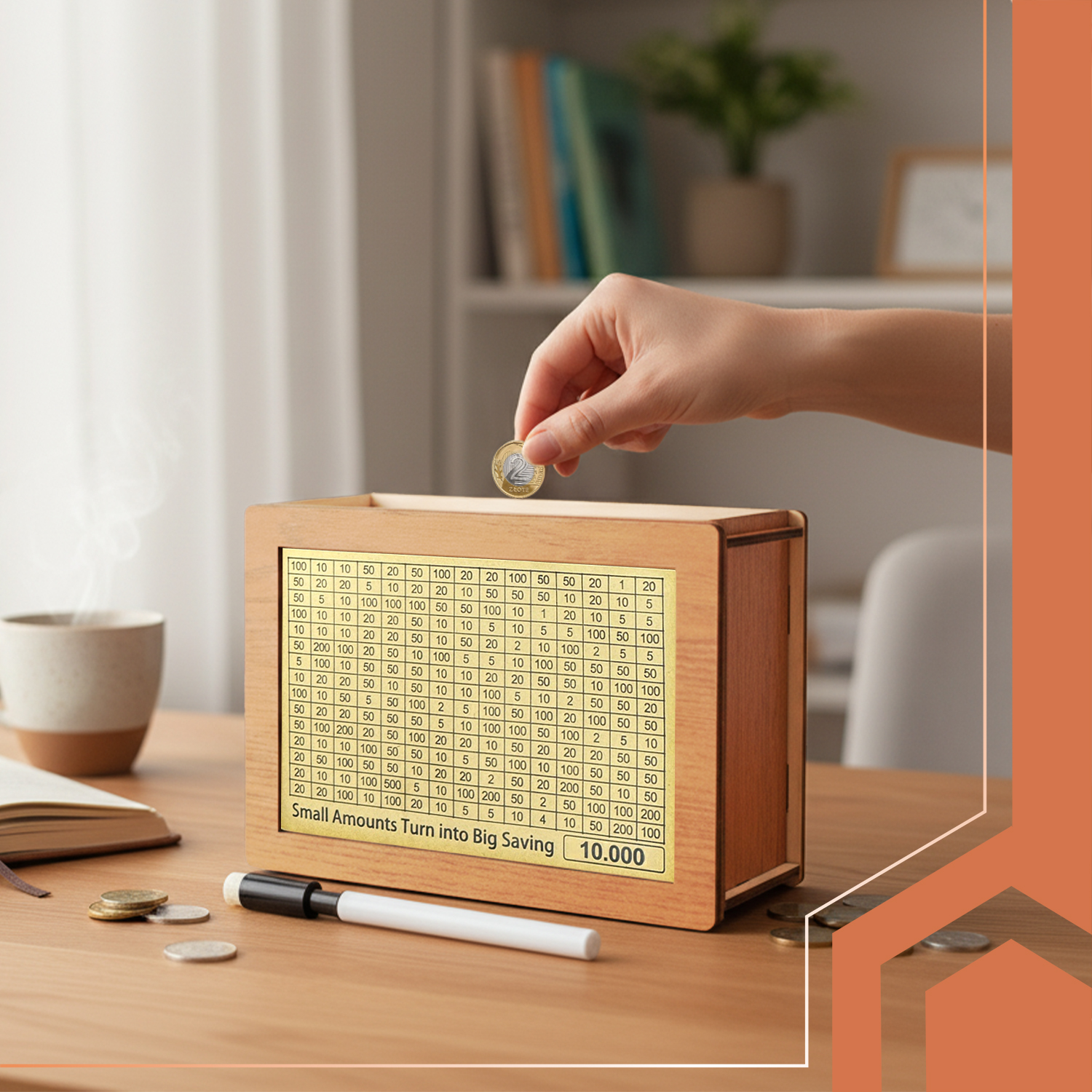 Muuda raha kogumine mänguliseks ja eesmärgipäraseks! Puidust säästupank “10 000” väljakutsega aitab sul või sinu lapsel koguda raha süsteemselt, jälgides iga sammu visuaalselt. Iga täidetud ruut viib sind lähemale seatud eesmärgile – olgu selleks reis, suurem ost või lihtsalt parem rahaline distsipliin.