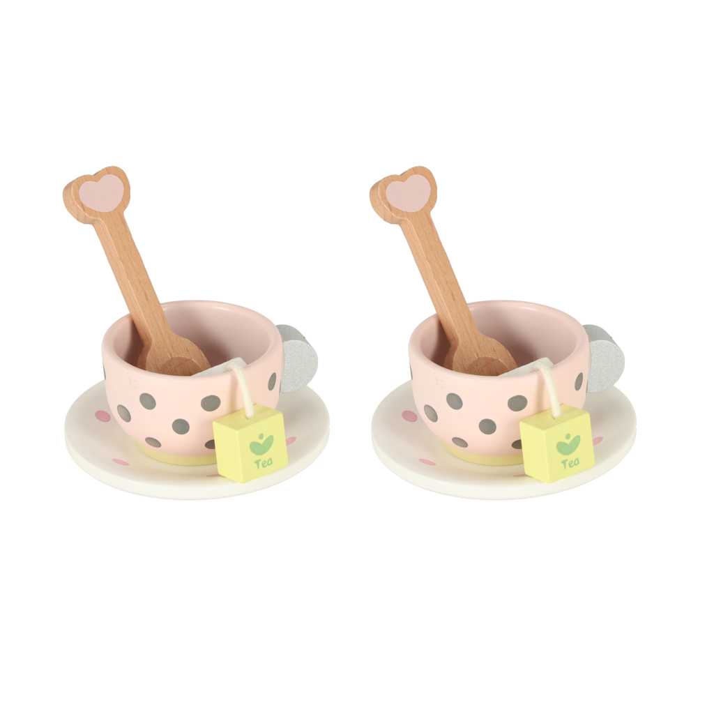 - Rikkalik elementide valik – Komplekt sisaldab tasse, taldrikuid, teekannu, piimakannu, lusikaid, teepakke ja küpsiseid – kõike, mida on vaja väikese peo korraldamiseks.