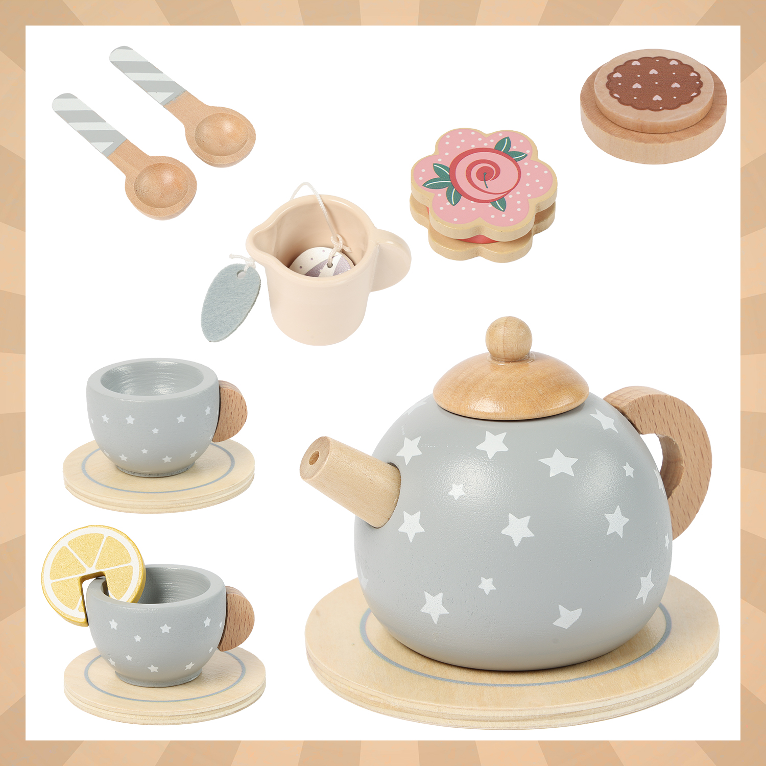 - Rikkalik lisatarvikute komplekt – veekeetja kaanega, piimakann, tassid alustassidega, lusikad, küpsised, sidruniviil, teepakk ja käepidemetega kandik tagavad sisuka loova mängu.