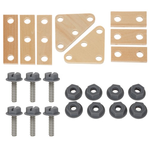* Tööpinnal on suur hulk auke, kuhu saab kruttida kruve ja kinnitada kaasasolevaid puidust detaile. Erinevate konstruktsioonide koostamine ja kinnitamine on põnev ja arendav tegevus. Esiküljel on ka keeratava süsteemiga kruustangid