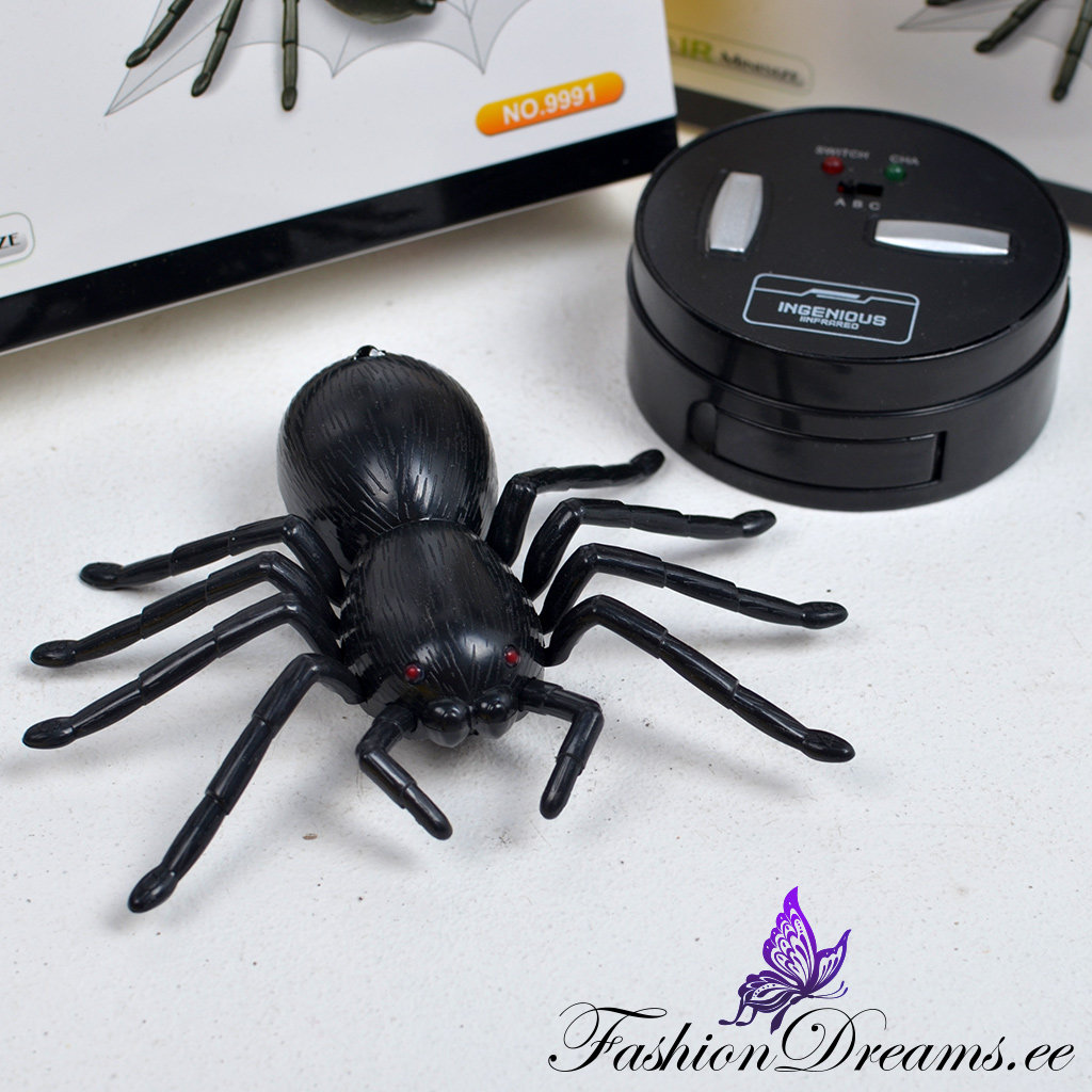 * Puldi sisse käib 3 AA patareid (ei ole kaasas). Ämblikul sees aku – puldi küljel on väike luuk, kust tuleb välja juhe, millega ämblikut laadida saab.
