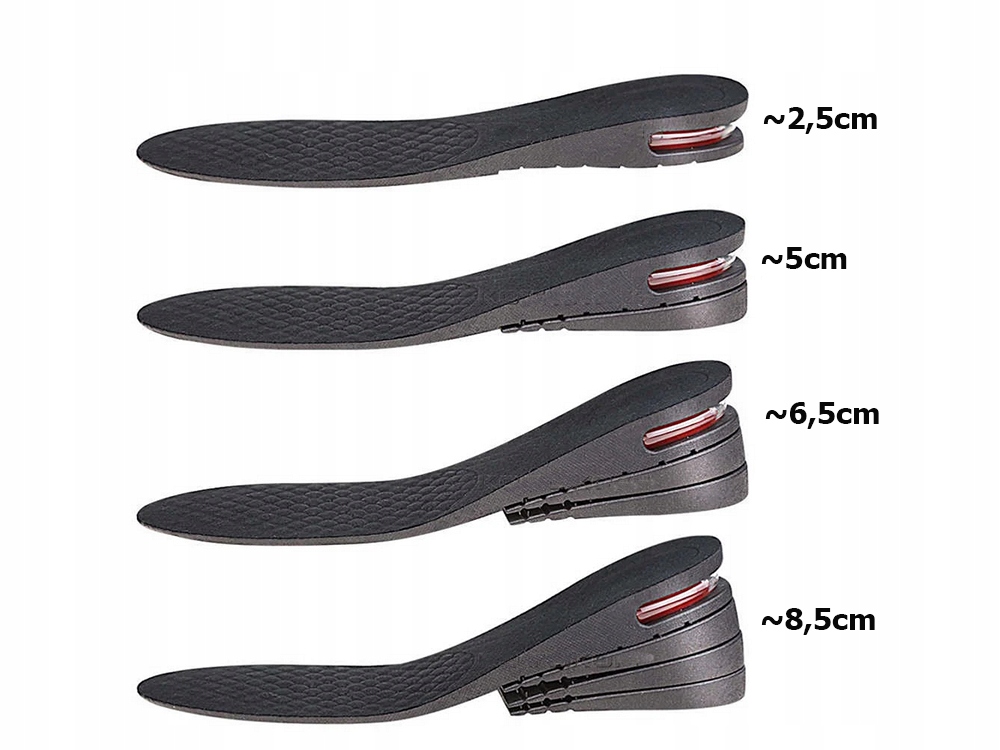 4 osa: +8,5 cm - Lisa pikkust või korrigeeri erinevusi – kannakõrgenduste abil saab lisada märkamatult ja loomulikul viisil pikkust. Samut kasulik abivahend neile, kelle on üks jalg veidi pikem kui teine – kannakõrgendus korrigeerib jalad visuaalselt ühepikkuseks ning ennetab ja leevendab seeläbi jalgade erinevast pikkusest tulenevaid vaevuseid.