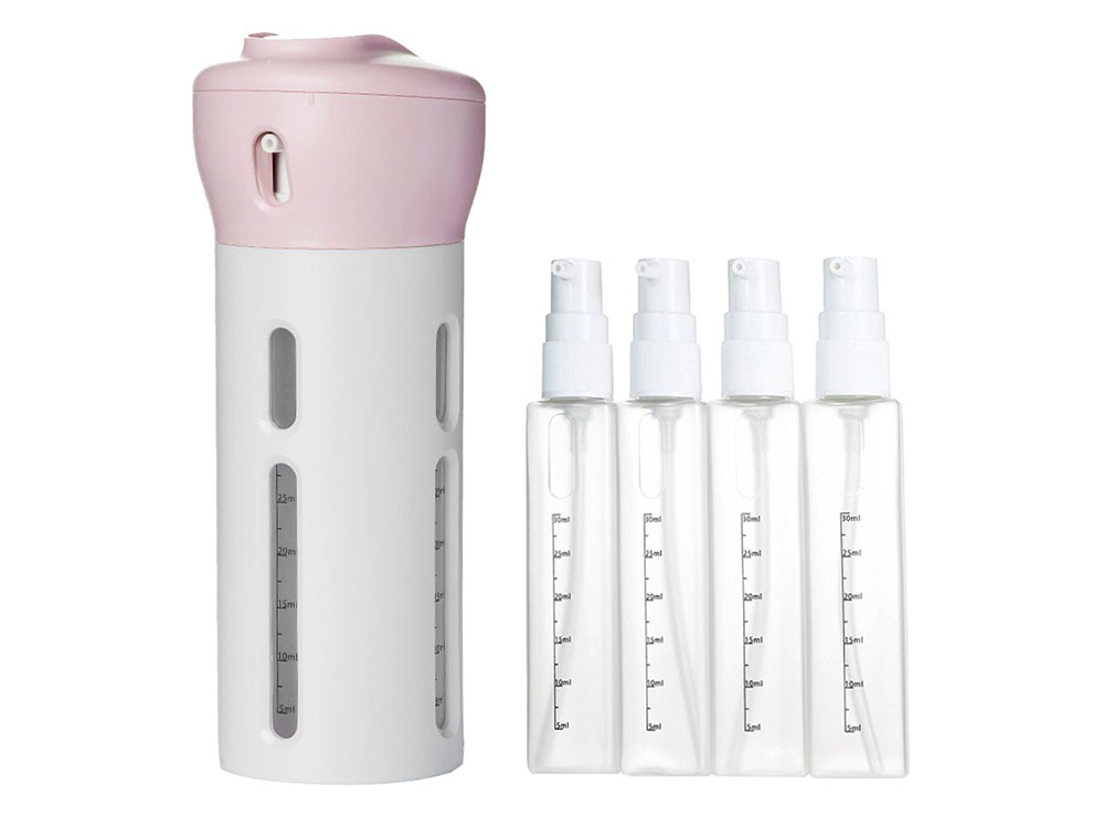 Praktiline reisiorganisaator aitab võtta vedelad kosmeetikatooted kaasa mugavalt ja ruumisäästlikult. Neli eraldi dosaatoriga pudelikest hoiavad šampooni, dušigeeli, näokreemi või muu vajaliku alati käepärast. Ideaalne lahendus käsipagasisse ja lühireisidele, kui soovid vältida suurte pudelite kaasavõtmist.