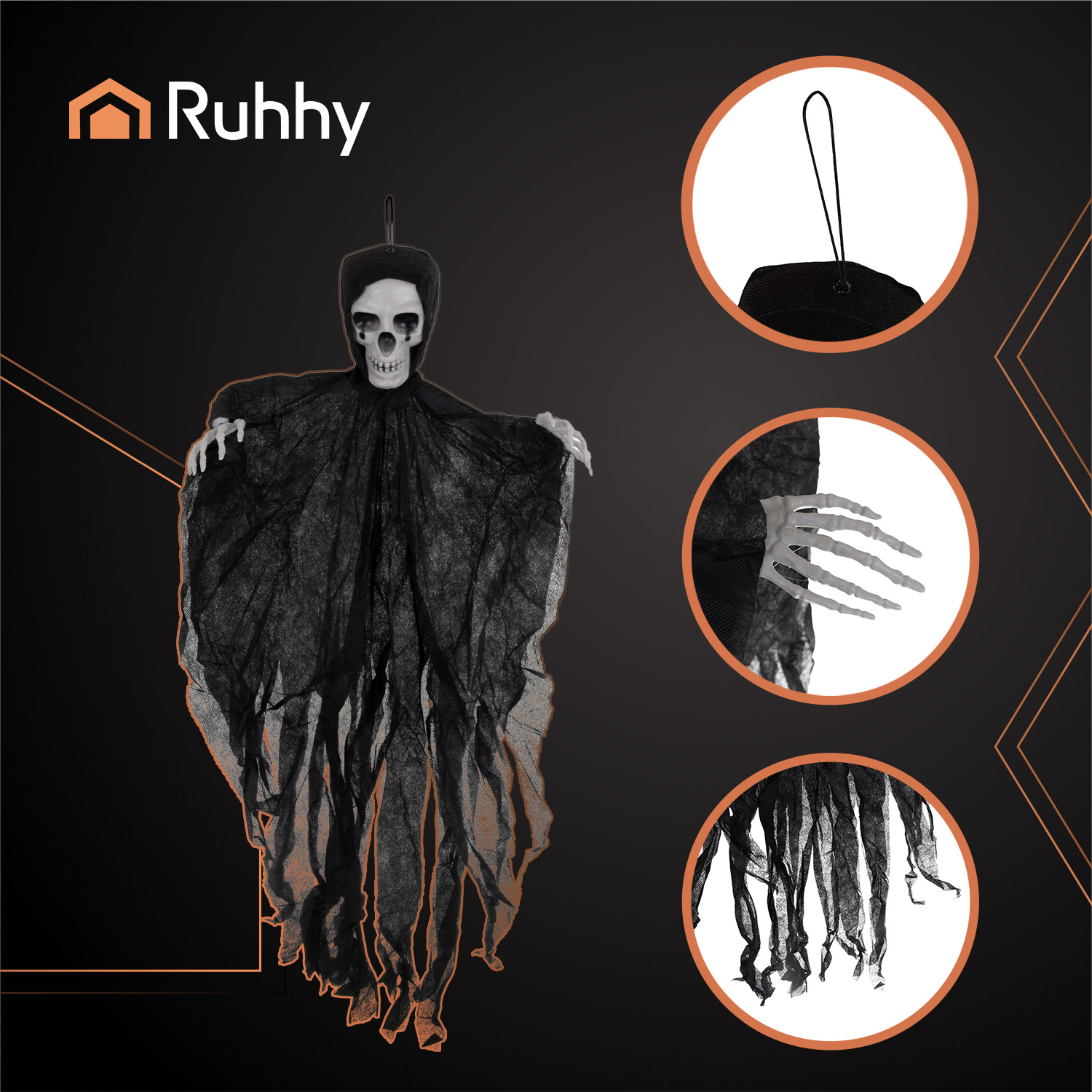 See riputatav must skelett on ideaalne kaunistus, mis loob hetkega õudusmeeleolu. Realistlik skelett koos kolju ja räbaldunud kangaga on silmapaistev element, mis tõmbab tähelepanu igal üritusel.