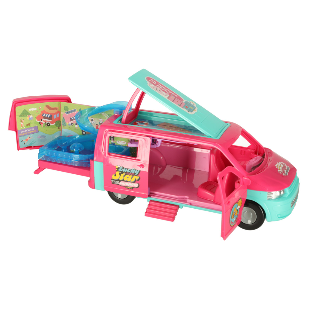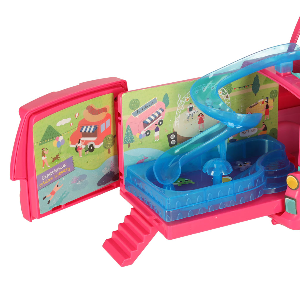 - Palju funktsioone: Lahtivolditav kamper pakub lastele võimalust luua oma seiklusrikkaid lugusid. Sellel on tõmmatav televiisor, trepid, kämpingutelk, bassein ja liumägi.