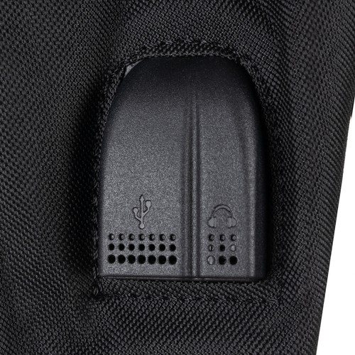 * Kotil on sisseehitatud USB pesa ja kõrvaklappide pesa. Saad näiteks akupanga kotipõhja panna ning telefoni koti küljest laadida või telefoni kotis hoida ja kõrvaklapid koti külge ühendada. Kaasas on ka ühenduskaablid.