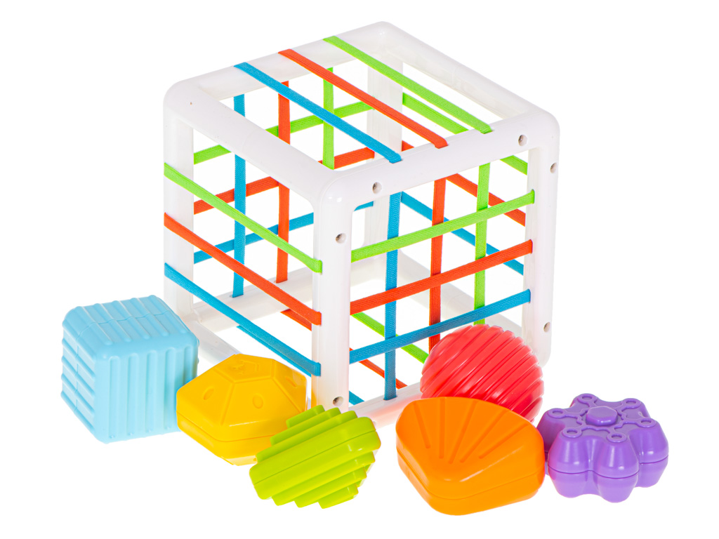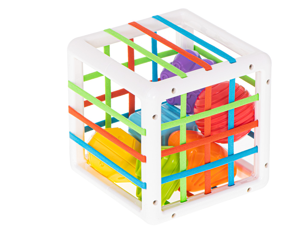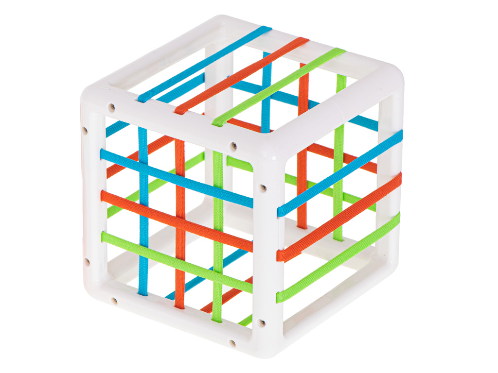 - Arendav “lükka läbi kummide” sortermäng – mängu sisu on lihtne ja nutikas: laps surub klotsid elastsete kummide vahelt kuubiku sisse ja tõmbab need sealt välja. See pakub palju korduvat, rahuldust pakkuvat tegevust ning õpetab läbi katsetamise.
