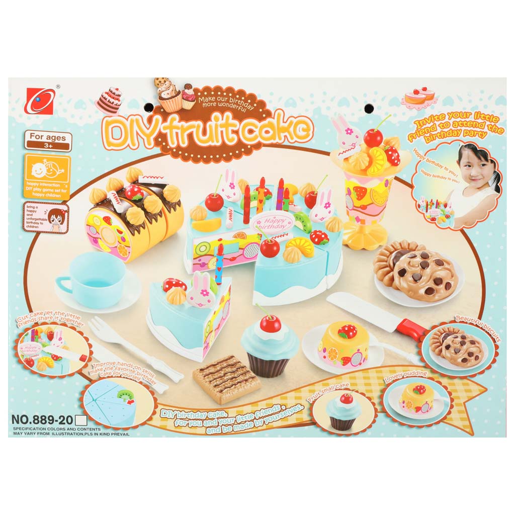 - Komplektis – 6 torditükki, 5 dekoratiivset küünalt, 1 kaunistus “Happy Birthday”, 14 beseed, 7 glasuuripulka, 4 jänkufiguuri, kleepsud, takjakinnituste komplekt; lisaks 4 kirssi, 4 mandariini, 3 maasikat, 3 kiivit, 3 muffinit, 3 küpsist, 3 rullbiskviidi tükki; 3 taldrikut, tass, jäätisepokaal, lusikas, kahvel, nuga ning tordilabidas.