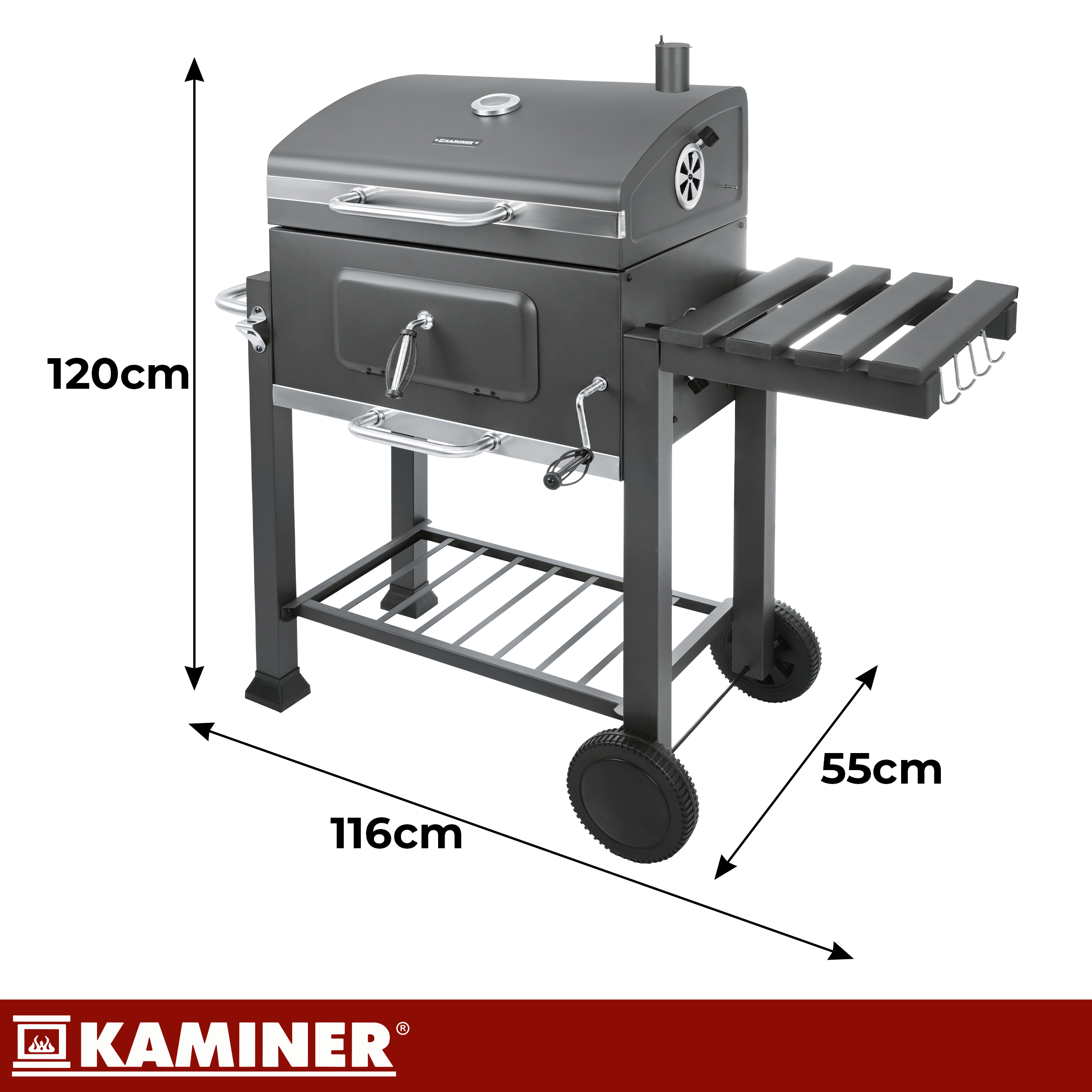 Tugev ja mitmekülgne söegrill on loodud neile, kes soovivad aias või terrassil grillida stabiilsema kuumuse, parema kontrolli ja suurema mugavusega. Malmrest, reguleeritava tõmbega korsten, termomeeter, väntmehhanismiga tõstetav söekamber ning praktilised riiulid muudavad grillimise sujuvamaks nii igapäevasel kasutamisel kui ka suurematel aiapidudel. Tegemist on komplektse lahendusega, mis sobib hästi mitmeks hooajaks.