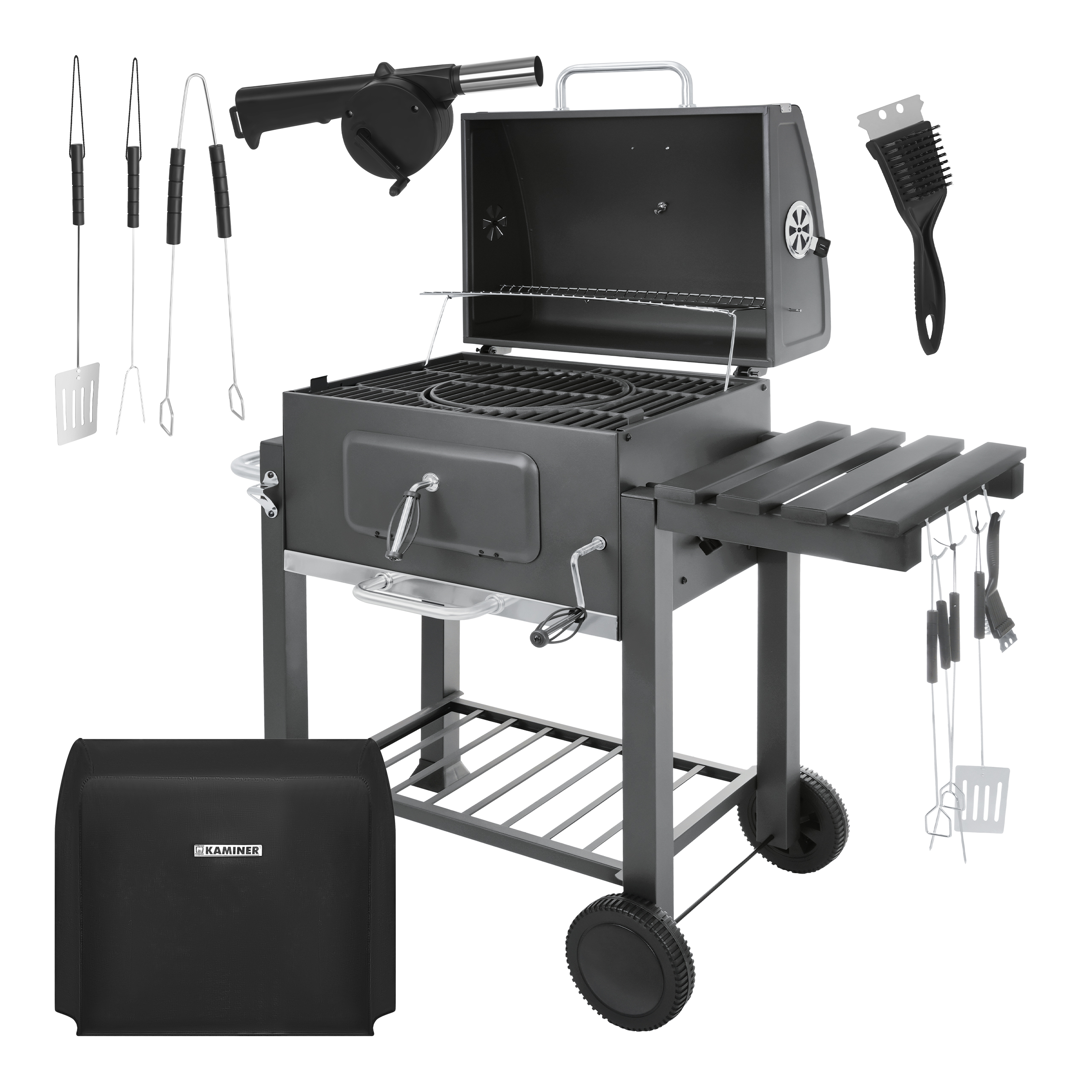 - Kaasas tarvikute komplekt – kaasas käsipuhur tule mugvaks süütamiseks, 3 töövahendit toidu tõstmiseks ja pööramiseks ning puhastushari-kaabits resti puhastamiseks peale kasutamist. Saad alustada grillimist ilma, et peaksid põhilisi lisasid kohe eraldi juurde ostma