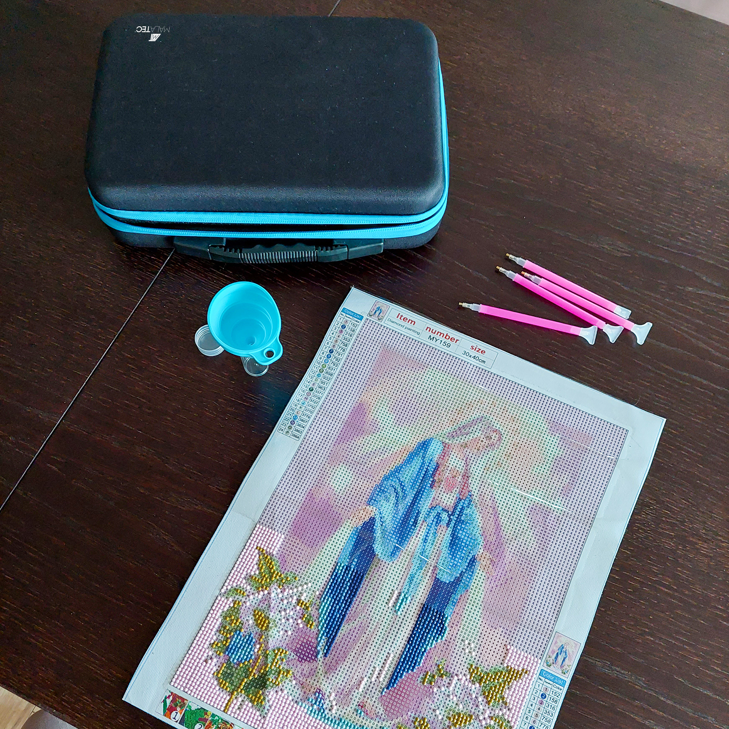 Mahukas ja praktiline teemanttikandi tarvikute komplekt, mis aitab hoida kõik vajalikud töövahendid ühes kohas. Tugev lukuga kohver ning läbimõeldud sisu muudavad mosaiikpiltide loomise mugavamaks, kiiremaks ja paremini organiseerituks.