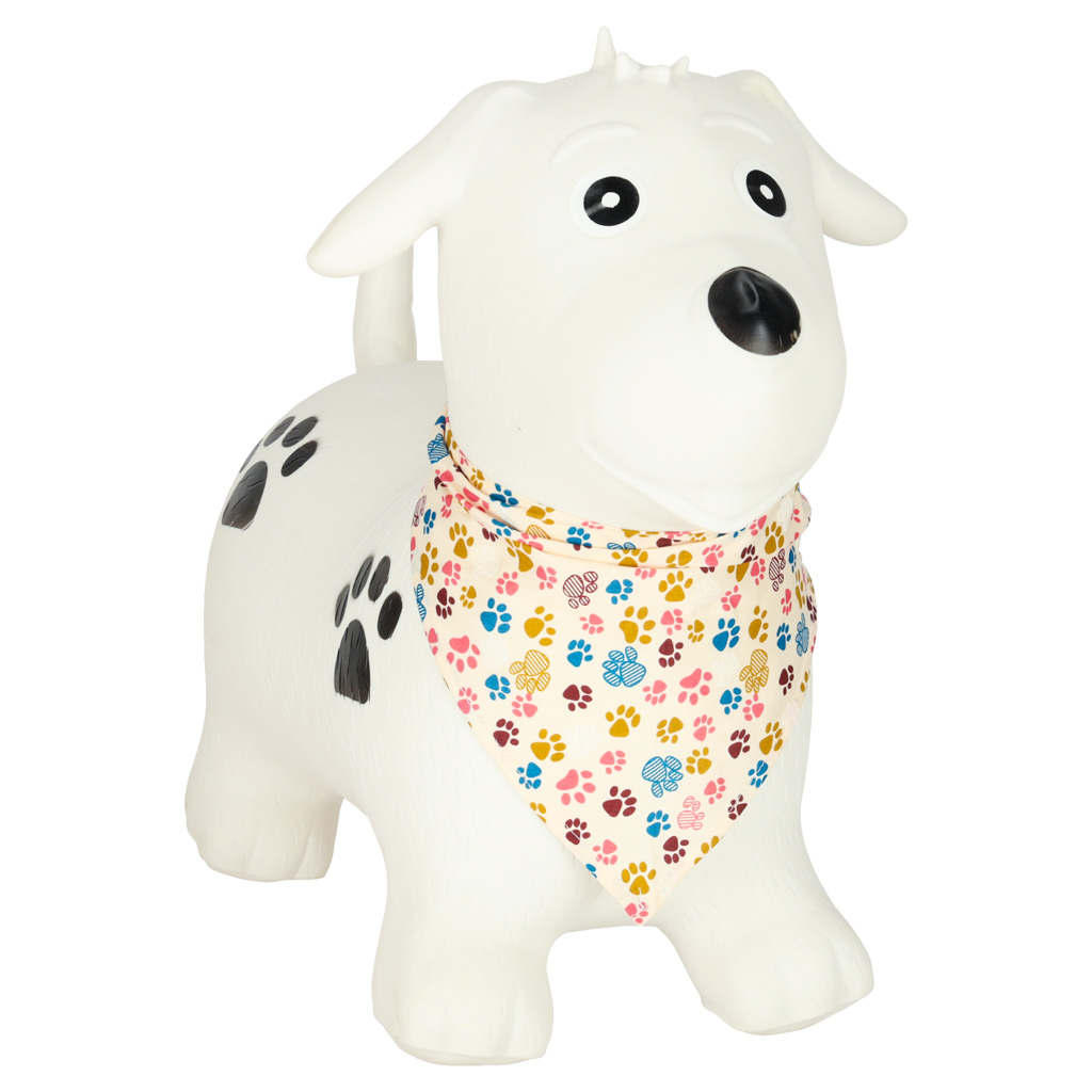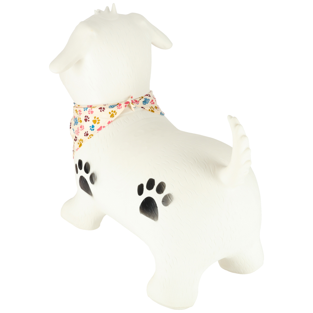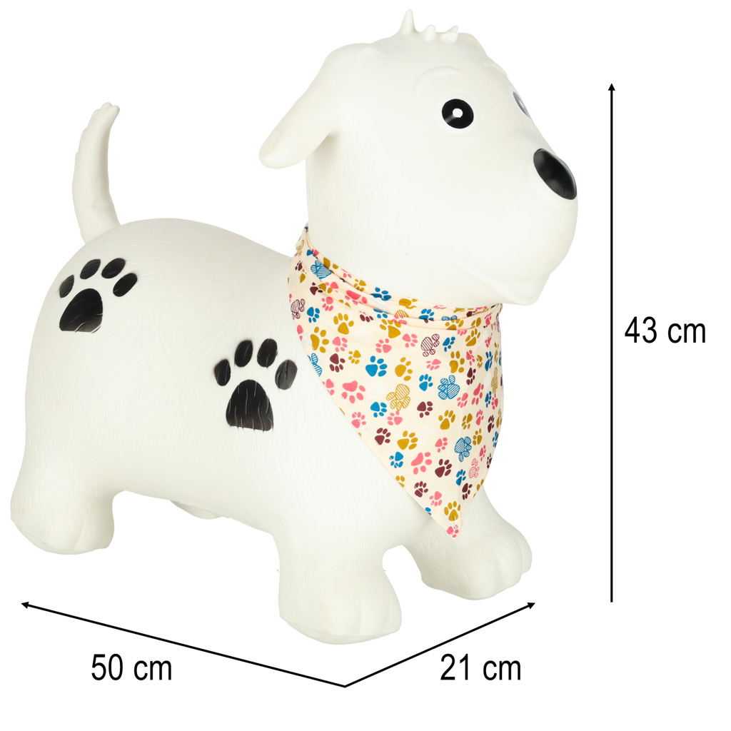 - Mänguline ja lapsesõbralik välimus – koerakujuline hüppeloom koos värvilise kaelarätikuga muudab mänguasja lapse jaoks veelgi toredamaks ja kutsuvamaks.