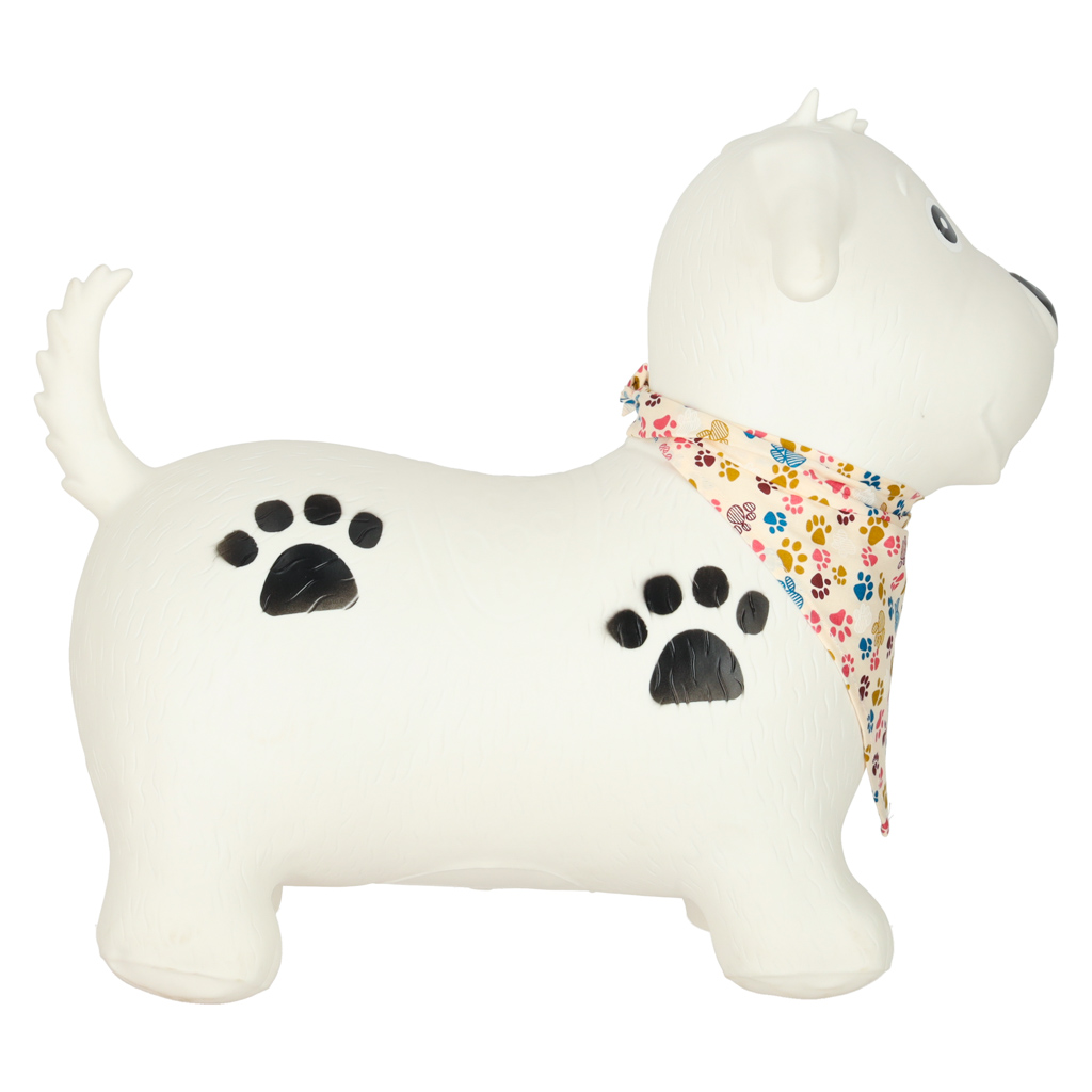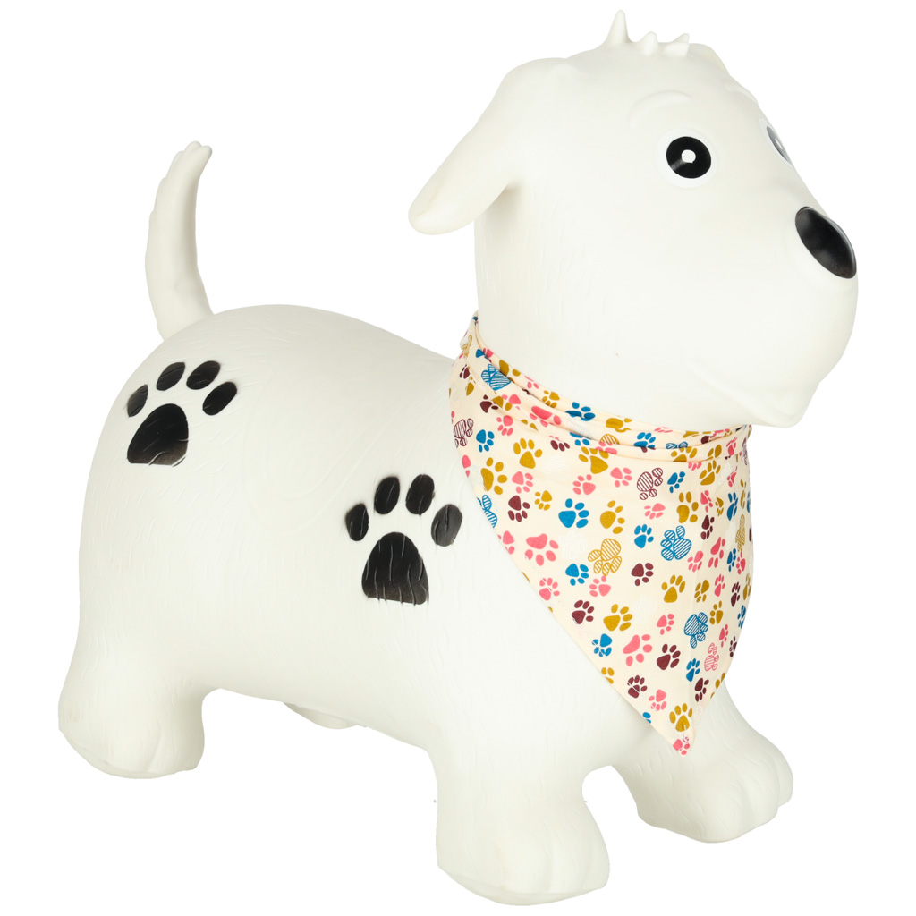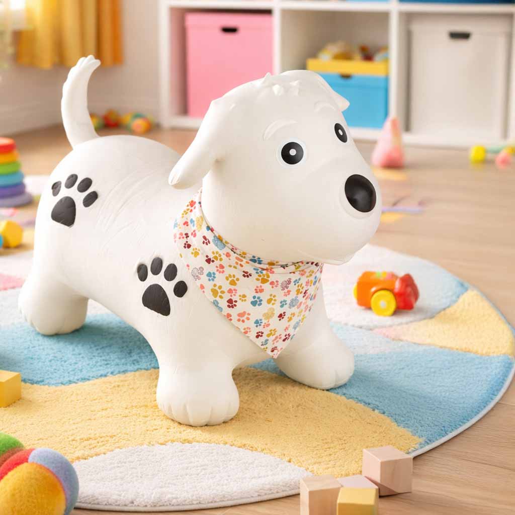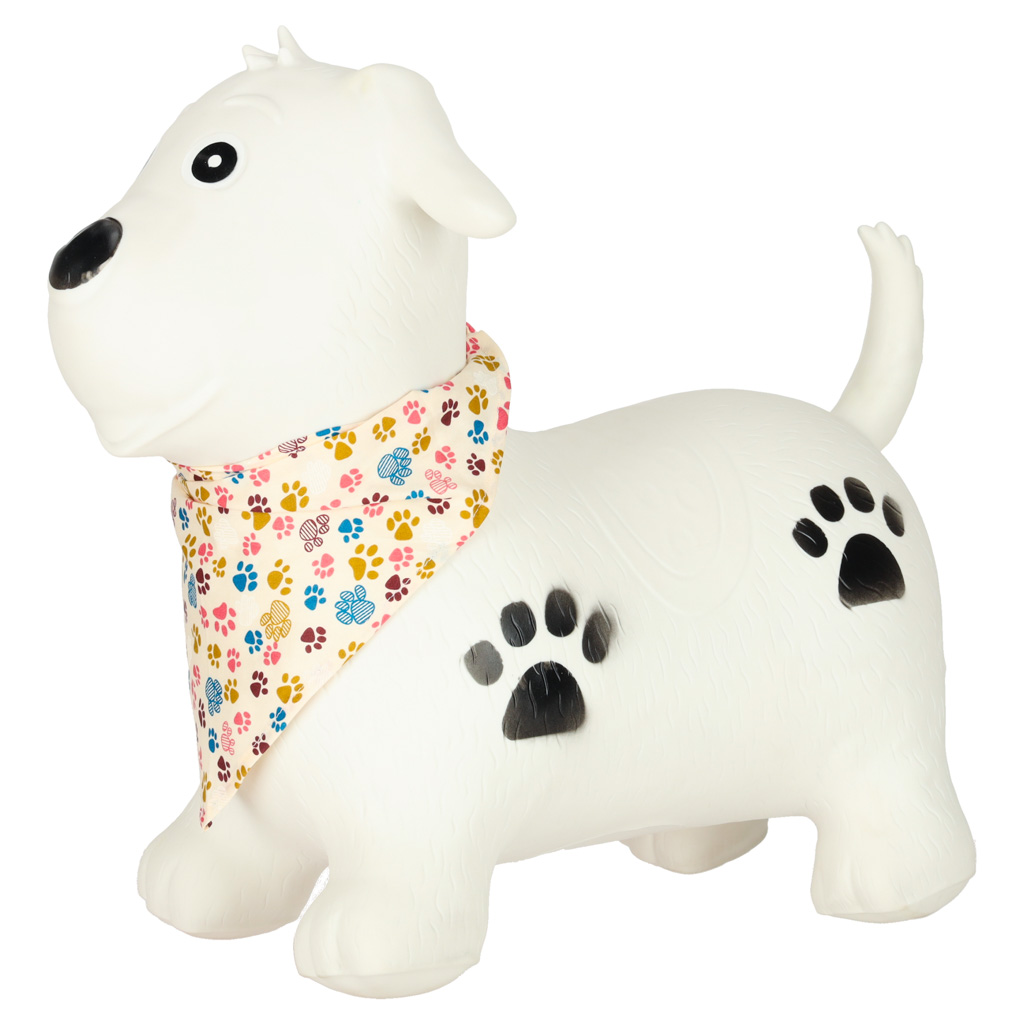- Mänguline ja lapsesõbralik välimus – koerakujuline hüppeloom koos värvilise kaelarätikuga muudab mänguasja lapse jaoks veelgi toredamaks ja kutsuvamaks.