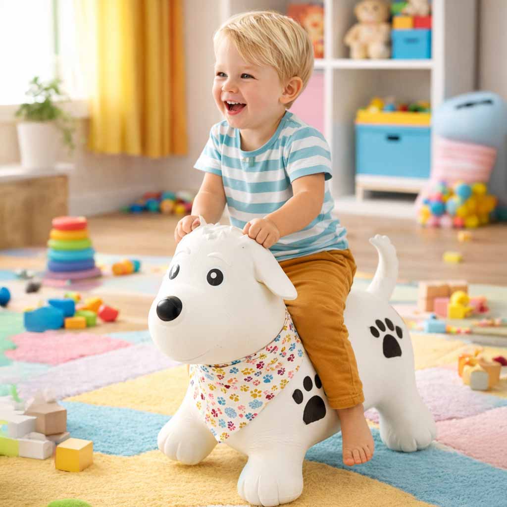 Täispuhutav hüppeloom pakub lapsele rõõmsat ja aktiivset liikumist nii toas kui ka õues. Koerakujuline hüppemänguasi aitab ühendada mängu ja kehalise tegevuse, toetades samal ajal tasakaalu, koordinatsiooni ja üldmotoorika arengut. Tänu elastsele materjalile ja läbimõeldud kujule saab laps mänguasjast mugavalt kinni hoida ning turvalisemalt hüpata ja liikuda.
