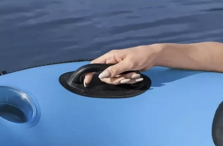 KASUTUS: Täida rõngas õhuga, kuni see on ühtlaselt vormis ja mugav. Kasuta käepidemeid ja ümberringi kulgevat turvaköit, et end vees paremini positsioneerida või rõngast transportida.
