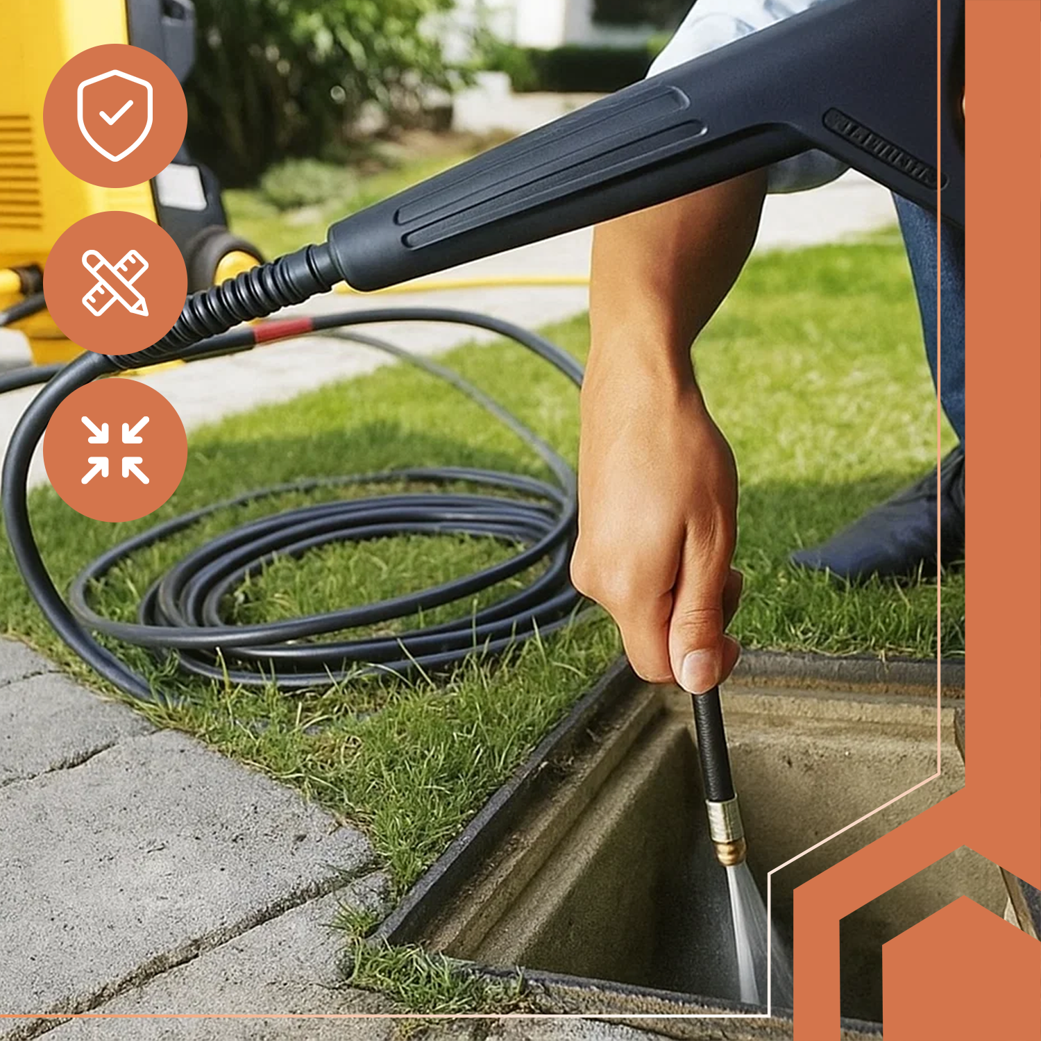 - 15-meetrine paindlik survevoolik: Eemaldab kergesti torude ummistused, muda sillutiskividelt või kuivanud mustuse tööriistadelt – ilma kemikaalideta, ilma lahtivõtmiseta, ilma kompromissideta.