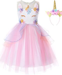 * Kleidi ülaosa kaunistatud nii eest kui tagant ohtrate 3D lilledega, lillede südamikud ehitud pärlite ja kristallidega. Esiosa ükssarviku teemalide disainiga
