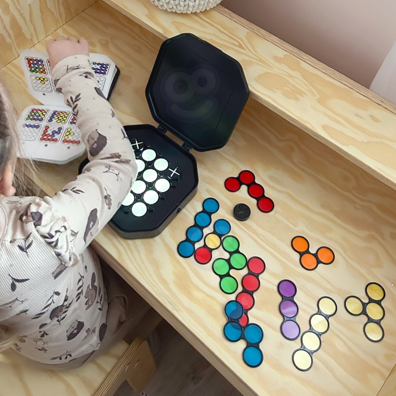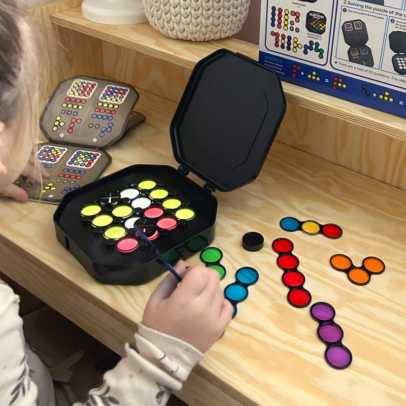 - Raskusastmed tõusevad järk-järgult, pakkudes avastamisrõõmu ning arendades lapse loogilist mõtlemist, ruumitaju, värvitaju, visuaalse analüüsi võimet ning värvide segunemise printsiipi. Hea mäng rahulikuks nuputamiseks – parandab keskendumisvõimet ja kannatlikkust.