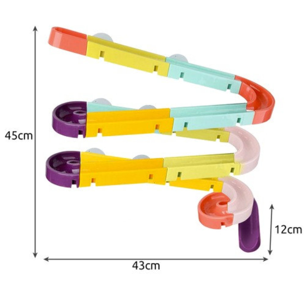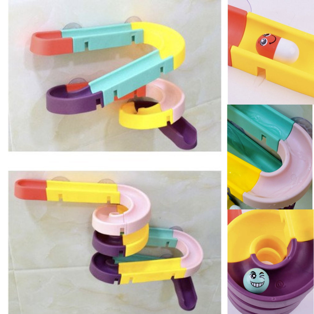 * Iminapp-kinnituste abil saab rajatükid vanni või seinaplaatide külge kinnitada ning sealt siis pallikesi koos veega alla sõidutada