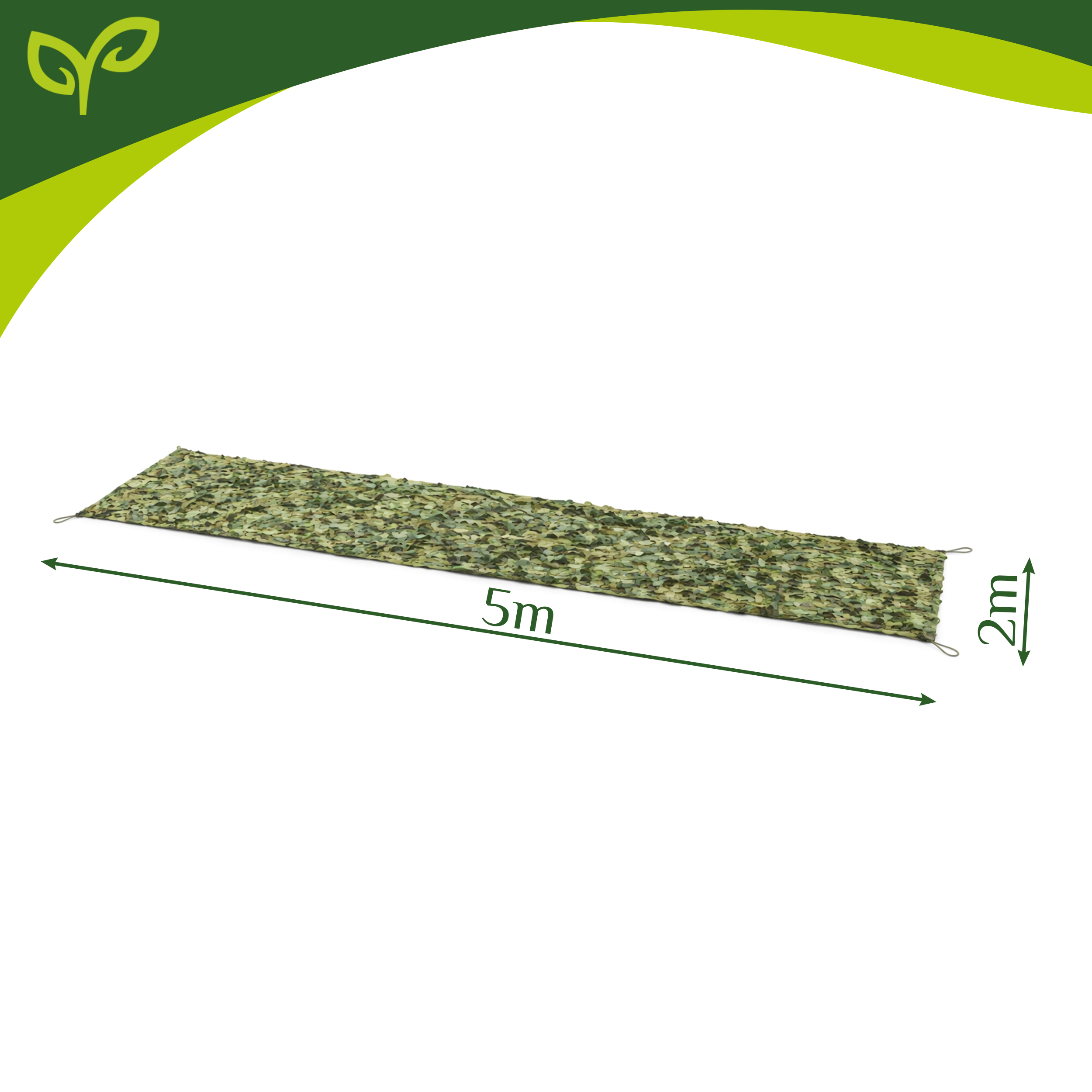 Suur 2 × 5 meetrine kamuflaažvõrk on praktiline lahendus privaatsuse loomiseks, varjutamiseks ja varjamiseks nii aias kui välitingimustes. Camo-mustriga roheline võrk hajutab valgust, sulandub loomulikult keskkonda ning sobib kasutamiseks kogu hooaja vältel – sõltumata ilmast.