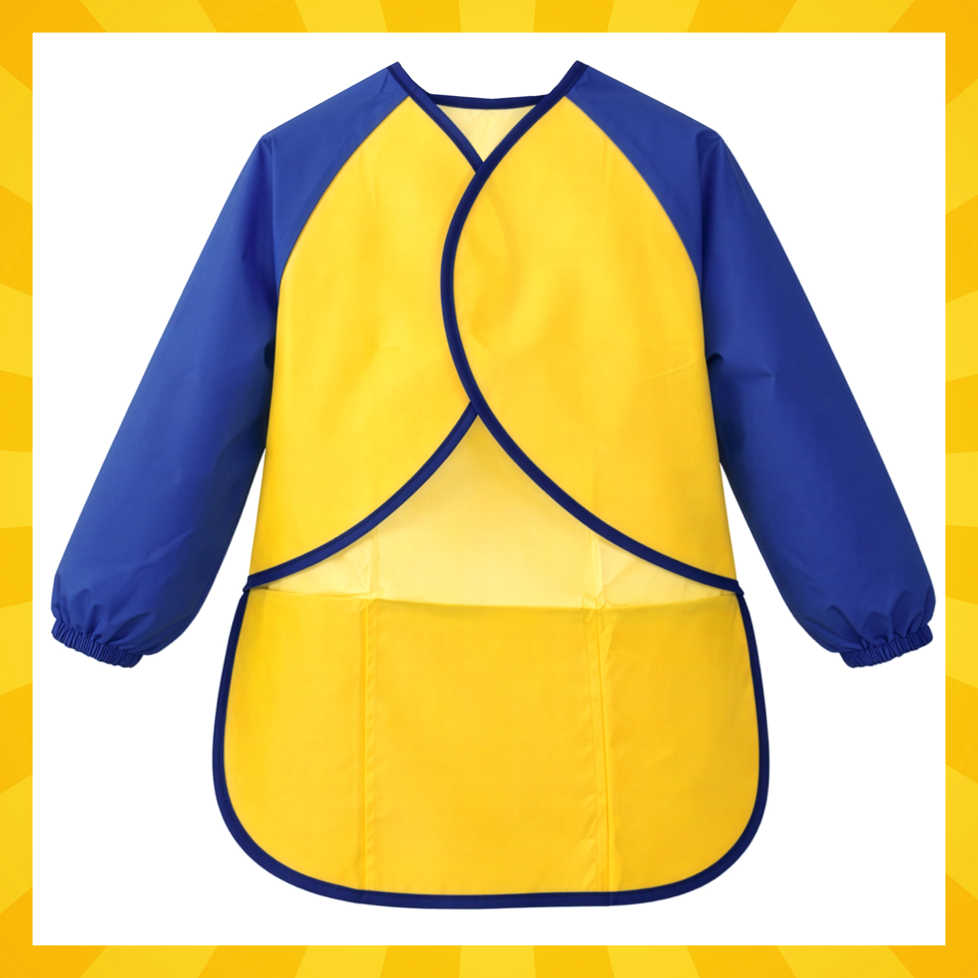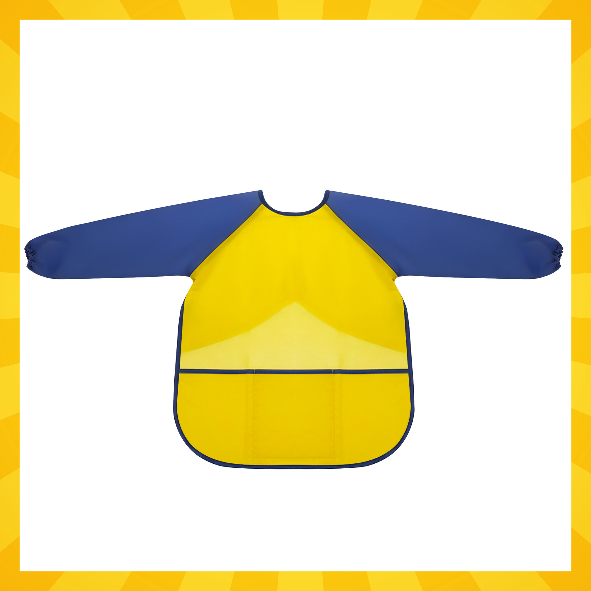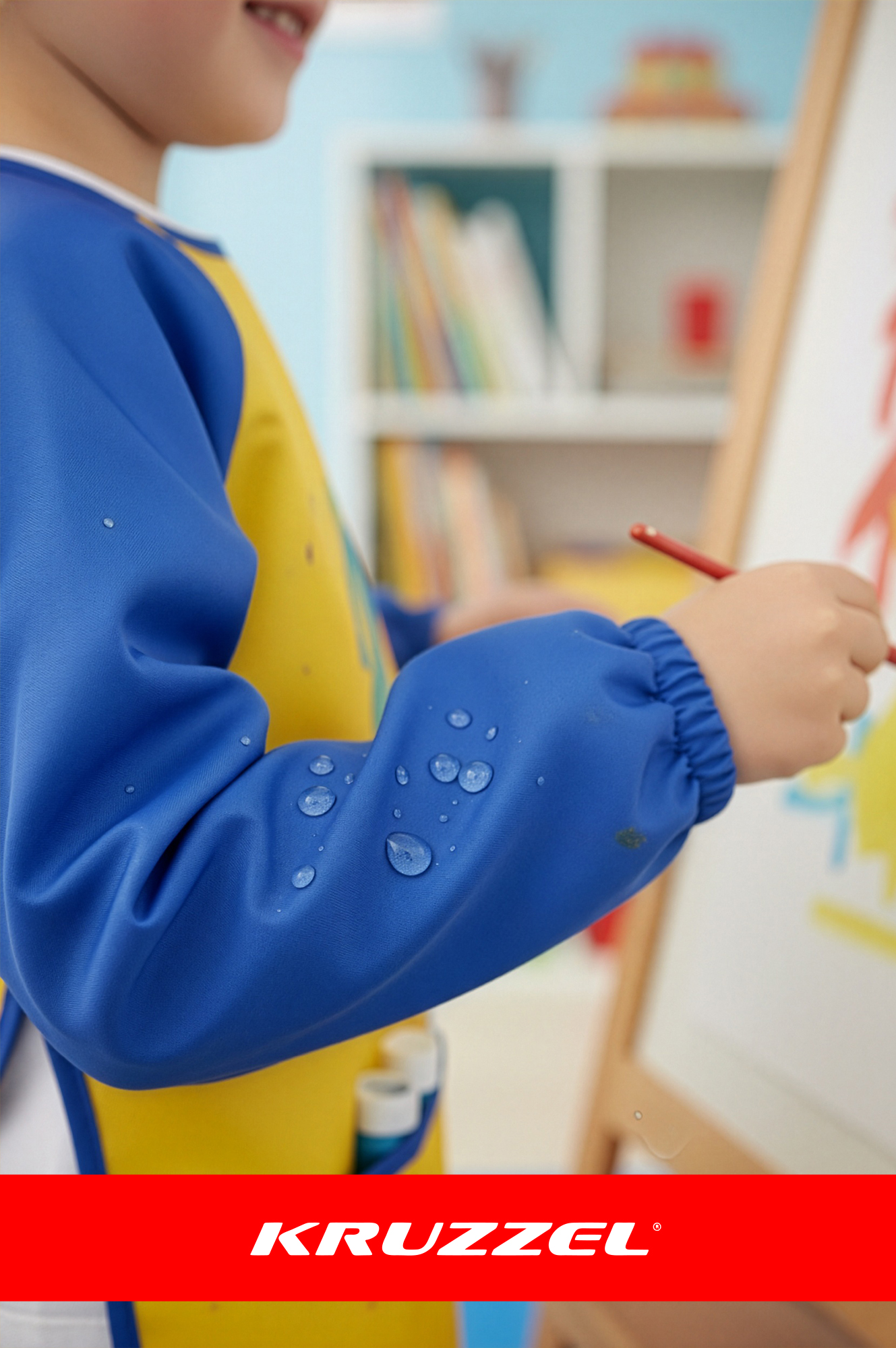 - Pikad varrukad elastsete mansettidega – käed ja õlad on kaetud kuni randmeni ning mansetid hoiavad varruka paigal, et see liikumisel üles ei libiseks. See on eriti kasulik siis, kui laps tegutseb aktiivselt ja kasutab palju vett või värve.
